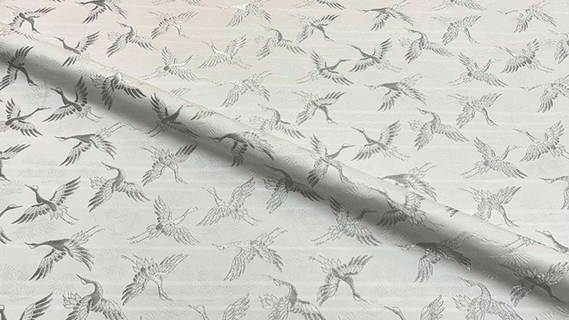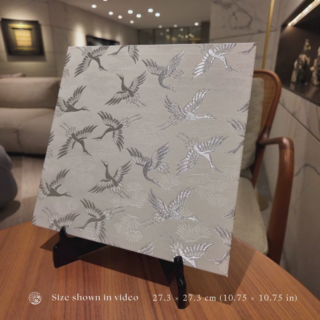 The pine tree has long been revered in Japan as a sacred symbol of resilience and good fortune, flourishing with strength even in the harshest natural environments. Above these enduring pines, numerous graceful cranes soar in elegant motion. Their sweeping forms bring a sense of celebration and quiet grandeur, creating a fabric that feels both magnificent and dignified. The composition captures strength and longevity while expressing refined beauty in every detail.