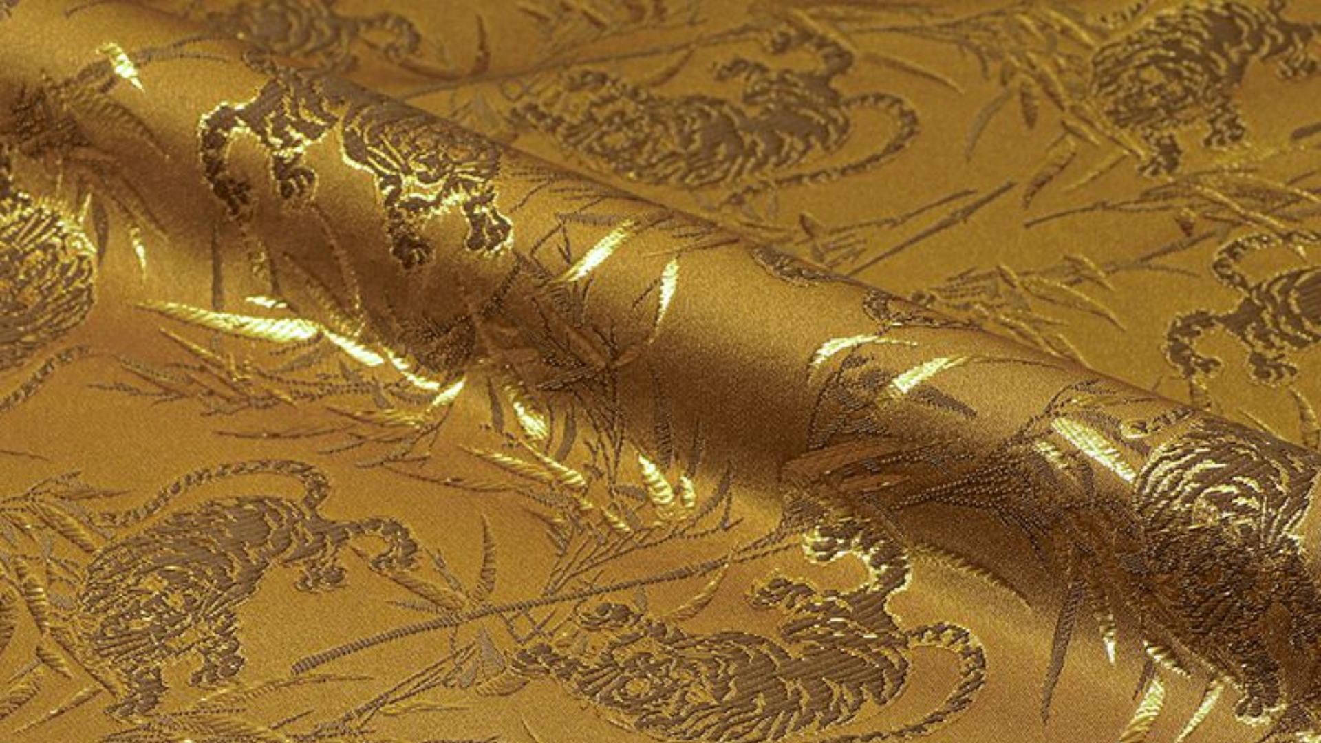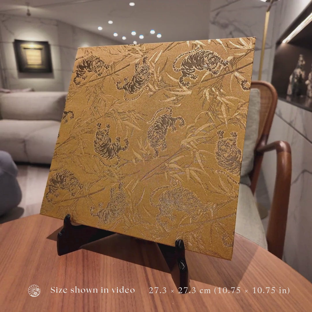 The tiger, long believed to dwell within bamboo groves, is often depicted together with sasa leaves as an inseparable motif. This pairing symbolizes courage grounded in nature, strength balanced by grace. In this kinran textile, both the tiger and bamboo grass are intricately woven in gold thread, heightening the intensity of the composition. The shimmering accents enhance the tiger’s commanding presence, while the flowing bamboo adds rhythm and movement. Bold and dramatic, the design captures raw power refined through craftsmanship, resulting in a fabric that radiates authority, vitality, and striking visual impact.