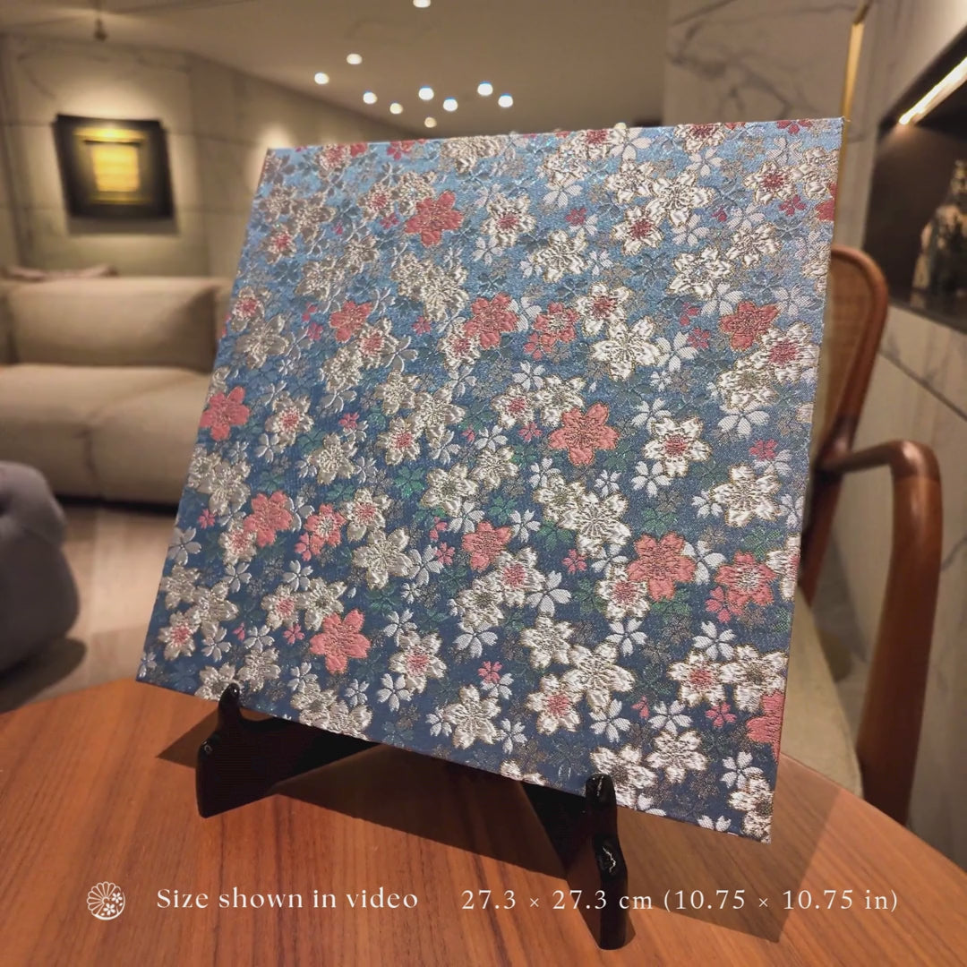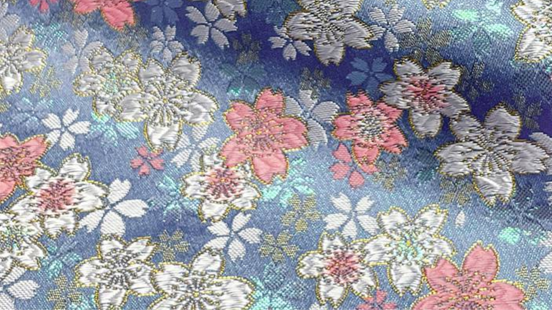 Cherry blossoms have been cherished throughout every era of Japanese history, though they began to appear as decorative motifs around the Heian period. While long regarded as the quintessential flower of spring, sakura designs today transcend the seasons, appreciated year-round for their timeless beauty. In this kinran textile, soft sakura pink and delicate pale blue create a gentle, harmonious ground. Across its surface, aurora-toned cherry blossoms shimmer with a subtle iridescence, catching the light with an almost ethereal glow. Elegant and luminous, the fabric captures the poetry of falling petals and the quiet romance of Japanese aesthetics, blending classical heritage with a modern radiance that feels both graceful and enduring.